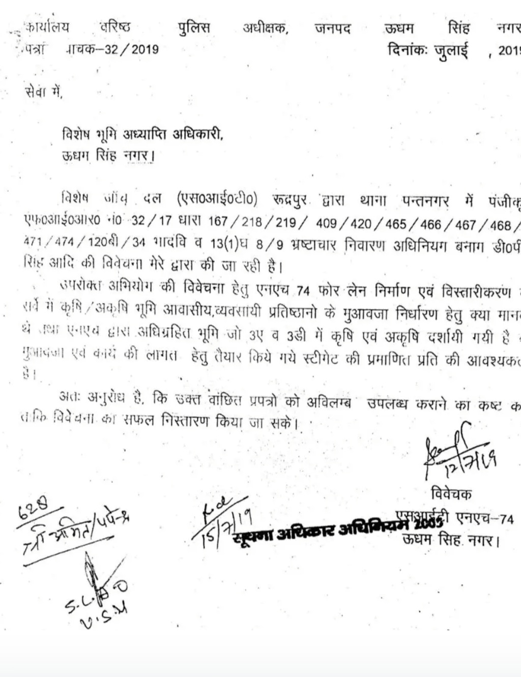चार्जशीट में पीसीएस अफसर डीपी सिंह पर सरकार द्वारा एनएच 74 के विस्तार हेतु अधिकृत की जा रही जमीन को अकृषक दिखा कर जमीन स्वामियों को कई गुना अधिक प्रतिकर निर्धारित करने के आरोप अध्यपित किए गए। जाहिर है कि विवेचक ने पूरी विवेचना करने के बाद ही चार्जशीट दाखिल की होगी, लेकिन हैरत की बात यह है कि चार्जशीट दाखिल करने के डेढ़ साल बाद विवेचक ने डीएम/ एसएलएओ को 12 जुलाई 2019 को पत्र लिखकर जमीन अधिग्रहण के मामले में बुनियादी जानकारी मांगी। यह पत्र खुद एसआईटी की भूमिका पर सवालिया निशान लगाता है। डीएम कार्यालय से तीन सितंबर 2019 को पत्र का जवाब देते हुए सभी शासनादेशों को हवाला देकर नियम कानून की जानकारी साझा की।
