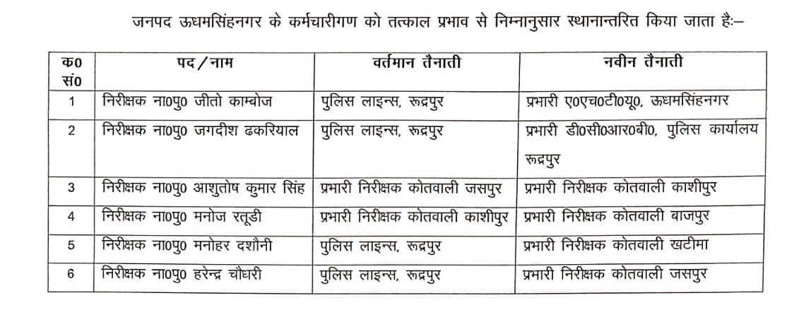 एसएसपी ने पुलिस लाइन से निरीक्षक मनोहर दसौनी को खटीमा और निरीक्षक हरेंद्र चौधरी को जसपुर कोतवाल तैनात किया है।इंस्पेक्टर जीतो कंबोज को प्रभारी एएचटीयू और इंस्पेक्टर जगदीश ढकरियाल को प्रभारी डीसीआरबी बनाया है।