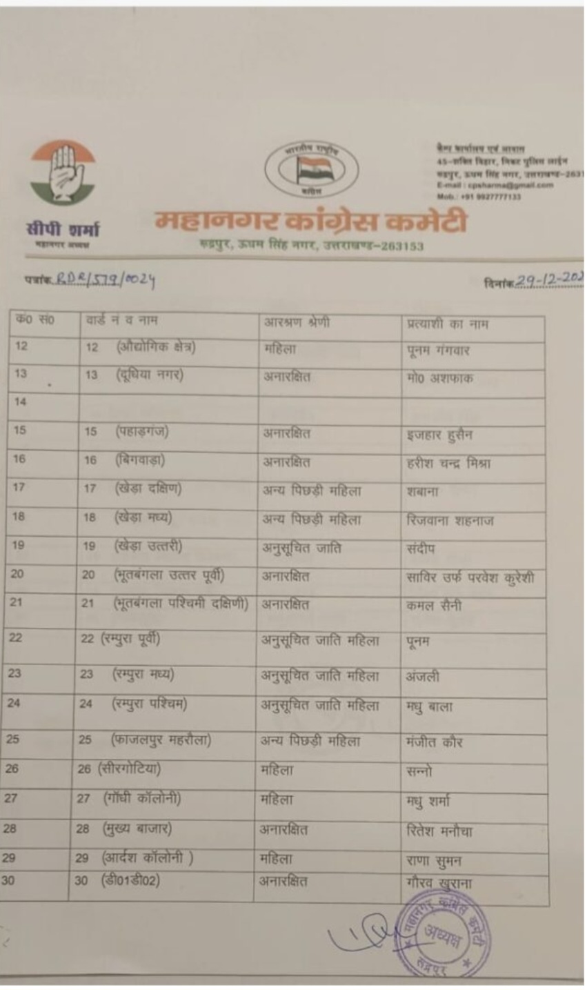 Uttarakhandकांग्रेस ने जारी की पार्षद प्रत्याशियों की सूची फणीन्द्र नाथ गुप्ता1 year ago01 mins रुद्रपुर। कांग्रेस ने रुद्रपुर के 40 वार्डों के लिए पार्षद प्रत्याशियों की सूची जारी कर दी है। भाजपा से बगावत करके आज ही कांग्रेस में शामिल हुए बबलू सागर को भी टिकट मिला है। इससे पहले कांग्रेस जिला कार्यालय पर लंबी बैठक चली। Post navigation Previous: विकास शर्मा भाजपा मेयर पद के प्रत्याशी घोषितNext: मोहन खेड़ा कांग्रेस से लड़ेंगे मेयर का चुनाव Leave a Reply Cancel replyYour email address will not be published. Required fields are marked *Comment * Name * Email * Website Save my name, email, and website in this browser for the next time I comment. Δ