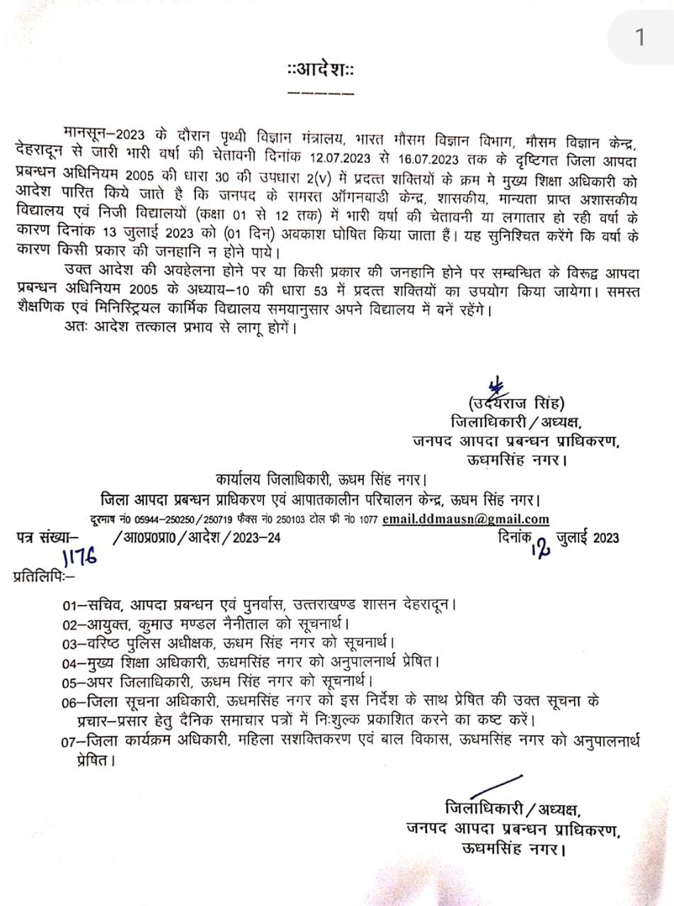 रुद्रपुर। जिले में भारी बारिश की चेतावनी के मद्देनजर ऊधम सिंह नगर के जिलाधिकारी उदय राज ने 13 जुलाई को जनपद के सभी आंगनवाड़ी केंद्र, राजकीय एवं निजी विद्यालय में अवकाश घोषित करने के मुख्य शिक्षा अधिकारी को आदेश जारी किए हैं।