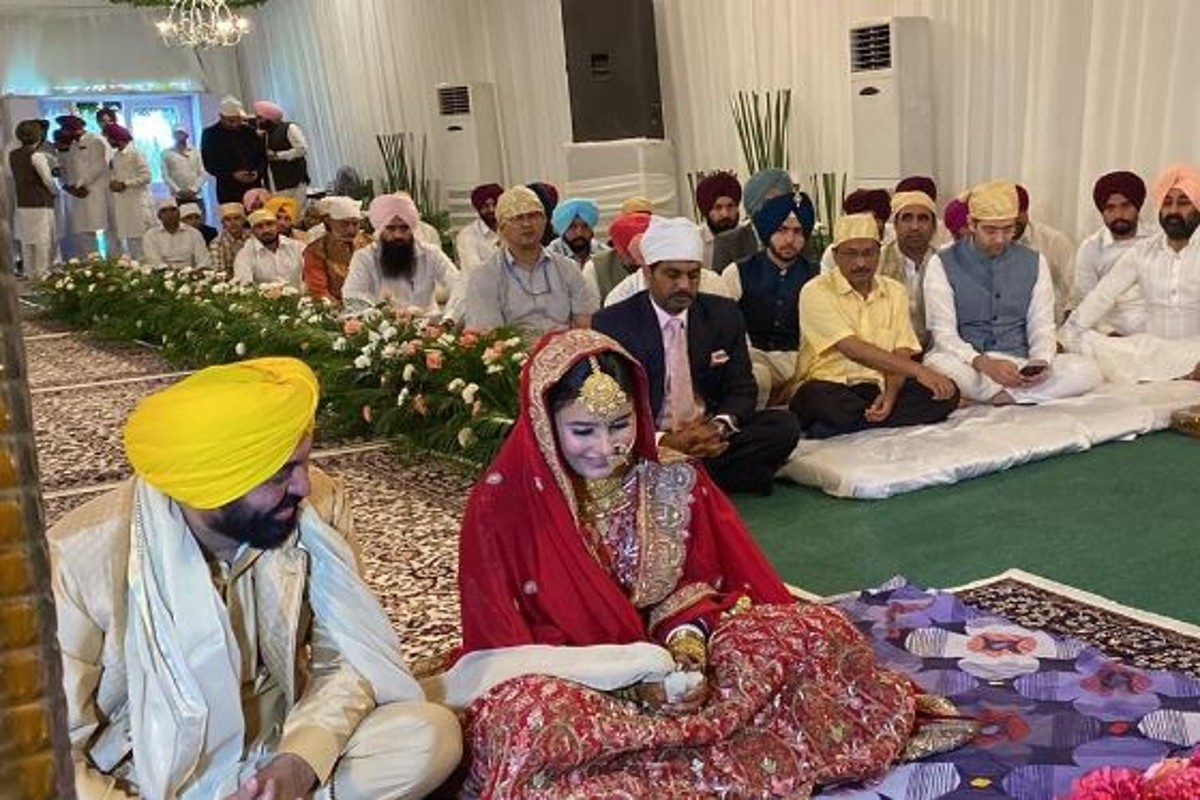 पंजाब के मुख्यमंत्री भगवंत मान शादी के बंधन में बंध गए हैं। शादी के बाद दुल्हन गुरप्रीत कौर के साथ उनकी तस्वीर भी सामने आई है। मुख्यमंत्री मान को दिल्ली सीएम अरविंद केजरीवाल ने शादी की शुभकामनाएं दीं। केजरीवाल पूरे परिवार के साथ सुबह ही चंडीगढ़ पहुंच गए थे। तस्वीर में शादी समारोह में शामिल हुए दिल्ली के मुख्यमंत्री अरविंद केजरीवाल समेत अन्य लोगों को देखा जा सकता है।