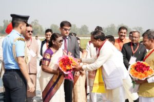 रुद्रपुर। राष्ट्रपति द्रौपदी मुर्मू के पंतनगर पहुंचने पर जिले की प्रथम नागरिक जिला पंचायत अध्यक्ष रेनू गंगवार, विधायक शिव अरोरा, भाजपा प्रदेश मंत्री विकास शर्मा सहित विभिन्न जनप्रतिनिधियों ने उन्हें गुलदस्ता भेंट कर स्वागत किया।