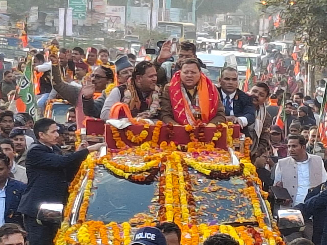 आज शाम मुख्यमंत्री पुष्कर सिंह धामी रुद्रपुर के गल्ला मंडी स्थित श्याम मंदिर पहुंचे। वह खुली कार में सवार हुए। उनके साथ सांसद अजय भट्ट, विकास शर्मा, विधायक शिव अरोरा, पूर्व विधायक राजेश शुक्ला व उत्तम दत्ता आदि वरिष्ठ नेता सवार थे। मुख्यमंत्री पुष्कर सिंह धामी, विकास शर्मा और शिव अरोरा के जिंदाबाद के नारों की गूंज के हर ओर से पुष्प गुच्छ और पुष्प वर्षा हो रही थी। पूरा वातावरण भाजपामय हो रहा था। मुख्यमंत्री पुष्कर सिंह धामी का रोड शो मुख्य बाजार होते हुए ट्रांजिट कैंप पहुंच कर समाप्त हुआ। खराब मौसम के बाद भी भारी भीड़ जुटी थी, जो सीएम की लोकप्रियता की गवाही दे रही थी।