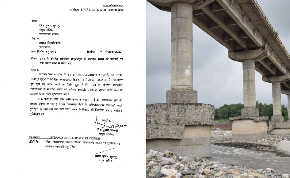 उपरोक्त विषयक लोक निर्माण अनुभाग-2, उत्तराखण्ड शासन के पत्र संख्या 3312/11 (2)/2022-28 (सामान्य) / 2022 दिनांक 15 सितम्बर, 2022 को निरस्त करते हुए मुझे यह स्पष्ट करने का निदेश हुआ है कि राज्य के अंतर्गत अवस्थित सेतुओं / पुलों के नजदीक खनन की कार्रवाई उत्तराखंड उपखनन चुगान नीति, 2016 के अनुसार किया जाना सुनिश्चित करें । प्रायः पुलों के आस पास अवैध खनन के कारण पुलों के क्षतिग्रस्त होने की घटनाएँ प्रकाश में आई हैं। अतः उल्लखित नीति के प्राविधानानुसार कार्यवाही करते हुए पुलों के आस-पास होने वाले अवैध खनन के विरुद्ध भी नियमित रूप से कार्रवाई सुनिश्चित करें।